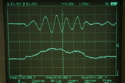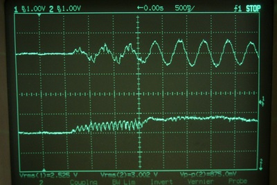 q軸電流を指令値に追従させるよう、電流フィードバックを行い、更にそれを使って回転速度フィードバック制御を実行してみました。下の写真は、回転速度を60 rpm一定に制御中にモータ軸に負荷トルクを加えた場合の波形です。上がU相電流、下が3相-2相変換を行って得たq軸電流です。負荷トルクはモータ軸を手でつまんでいるだけですので、大きく変動しています。